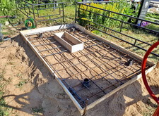 Далее выставляем опалубку, определяем место под цветник. Внутрь участка закладываем частую арматурную сетку. Там, где это возможно, привариваем её к сваям.