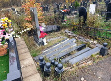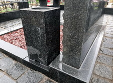 Завершающим этапом стала сборка оградки и укладка брусчатки. Ограждение мы создали из находившихся на могиле секций, кое где закрепив отломавшиеся навершия на разделительные столбики. Перед памятником мы установили гранитный цветник и две траурные урны, а по правую сторону от входа поставили заказанную клиентом лавочку, тоже изготовленную из чёрного гранита. Брусчатку мы замыли водой, одновременно удаляя всю строительную пыль, образовавшуюся в процессе работы.